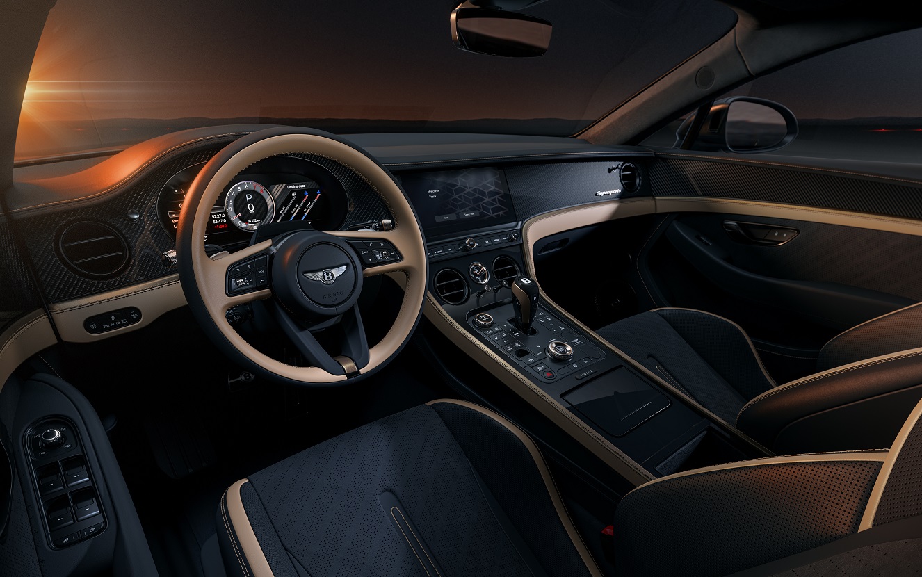 В салоне стоят два облегчённых спортивных сиденья с электрорегулировкой в 11 направлениях и подогревом. Отказ от гибридной системы и полного привода, а также демонтаж задних сидений и крыша из углеродного волокна позволили снизить снаряженную массу машины до 1 999 кг - это самый легкий Continental GT из когда-либо созданных.