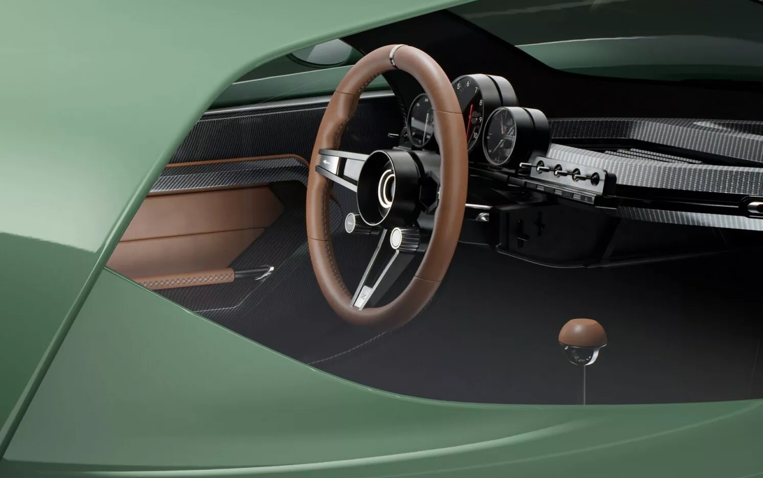 Внутри - группа аналоговых приборов с особо выделяющимся тахометром. Вместо экрана мультимедиа - небольшой дисплей для камеры заднего вида, который можно убрать, когда он не нужен. Сидения зафиксированы, а рулевую колонку, педальный узел и рычаг механической коробки передач можно точно настроить для достижения идеального положения водителя.