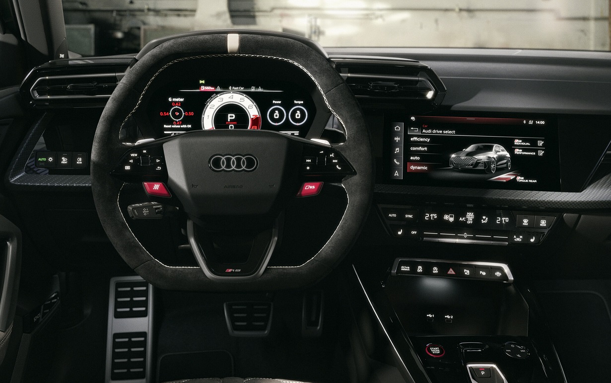 В салоне - чёрно-белая кожаная отделка, вставки из алькантары, спортивные сиденья RS с карбоновыми спинками, матовый серийный номер на центральной консоли, брендированные коврики. Плюс специальная графика для виртуальной приборной панели.