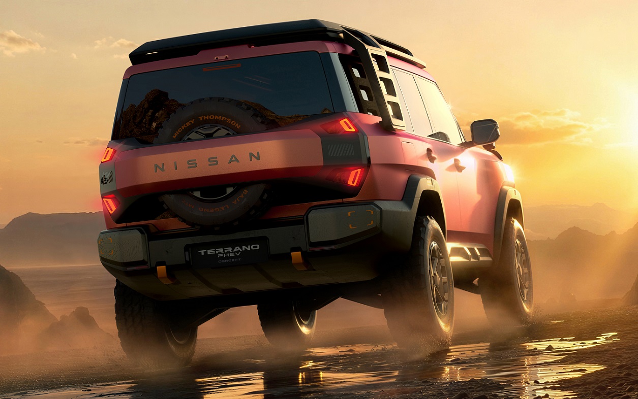 Nissan Terrano PHEV имеет массивную переднюю часть со светодиодными фарами и подсвеченным логотипом, защиту днища, буксировочные крюки и внедорожные фары, защитные пороги, рейлинги на крыше и квадратные чёрные колёсные арки, держатель запасного колеса сзади.